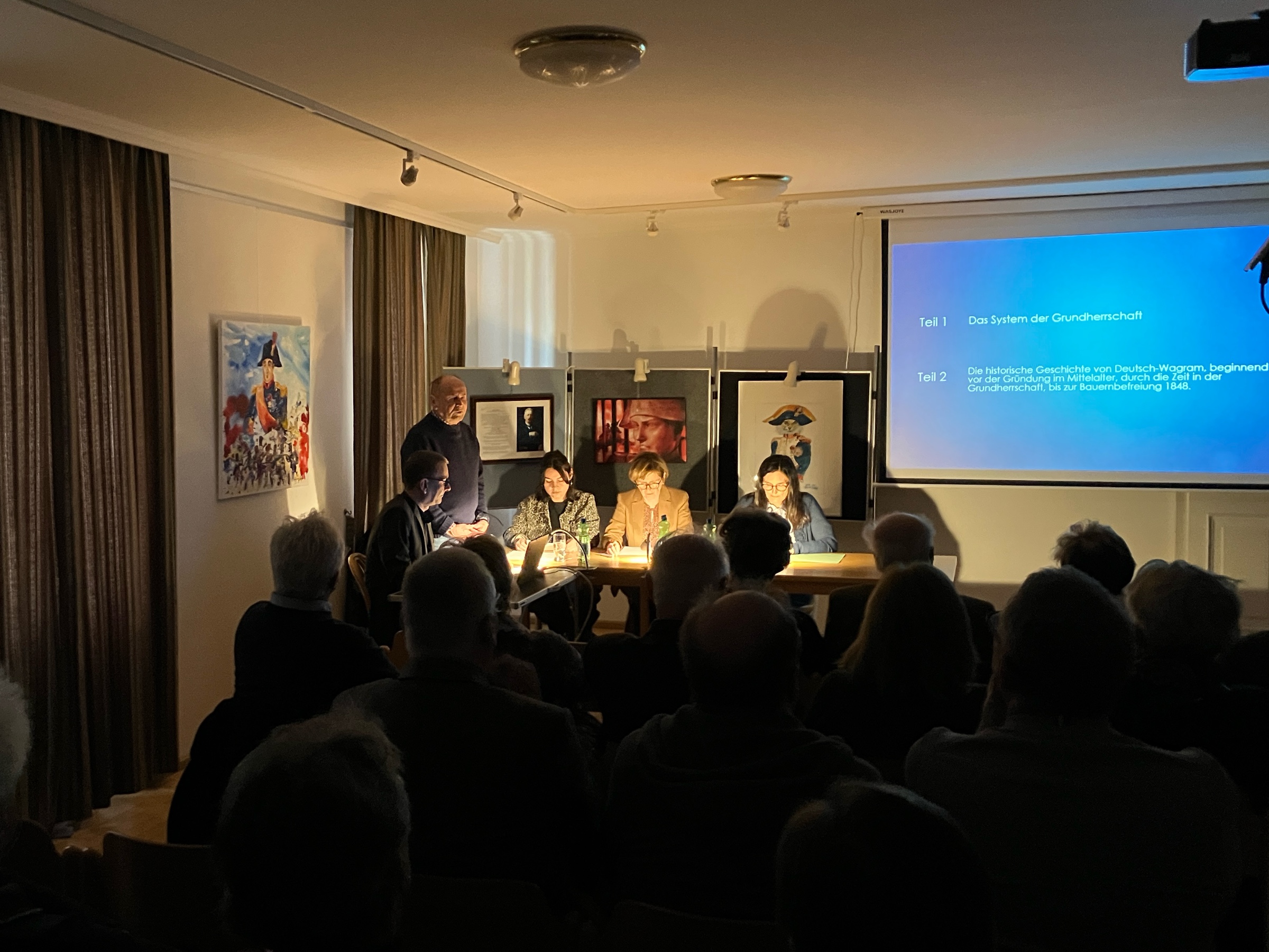 Unter dem Titel „Deutsch-Wagram in der Zeit der Grundherrschaften“ widmete sich Alfred Mühl, Chronist und Kulturbeauftragter der Gemeinde Aderklaa, gemeinsam mit seinem Team – Andrea Wittmann-Achmann, Christine Strametz und Katharina Sterl – einem zentralen Kapitel der regionalen Geschichte. In einer gelungenen Verbindung aus Lesung, Vortrag und Bildpräsentation wurde den Besucherinnen und Besuchern ein anschaulicher Überblick über die historischen Lebensverhältnisse in Deutsch-Wagram und Aderklaa vermittelt.