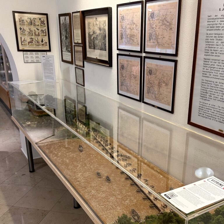 Dieses Diorama zeigt einen Ausschnitt des Schlachtfelds bei Deutsch-Wagram, am Ortsende Richtung Baumersdorf (heute Parbasdorf).…