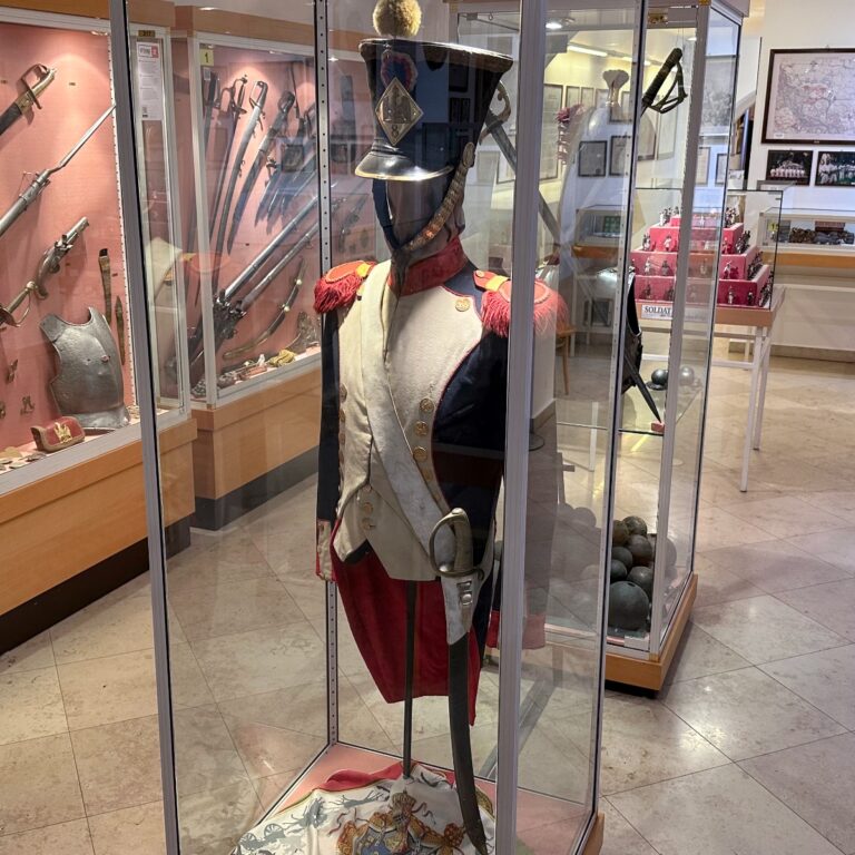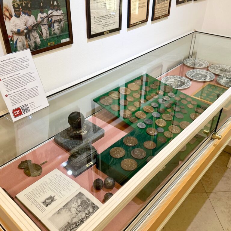 In dieser Vitrine werden unterschiedliche Bereiche der kaiserlichen Artillerie anschaulich vorgestellt. Zu sehen sind eine…