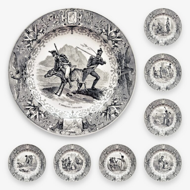 Acht französische Andenkenteller aus der Zeit um 1840. Die Teller zeigen gedruckte Szenen mit Reiter-…