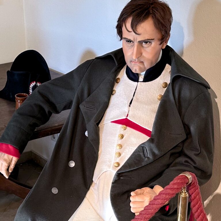 Professor Gerlinde Bartelt-Stelzer schuf diese lebensnahe Rekonstruktion Napoleon Bonapartes mit originalgetreu nachgebildeter Bekleidung. Die sitzende…