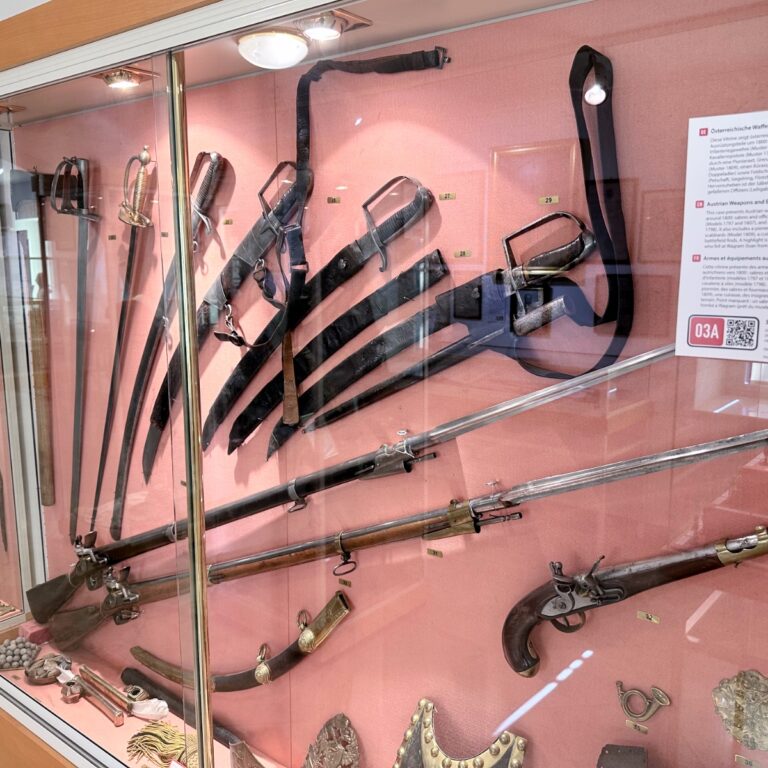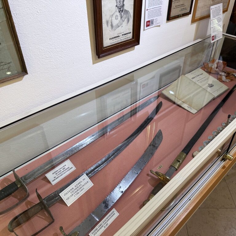 Diese Vitrine zeigt österreichische Waffen und Ausrüstungsteile um 1800: Säbel, Pallasche und Degen, Infanteriegewehre (Muster…