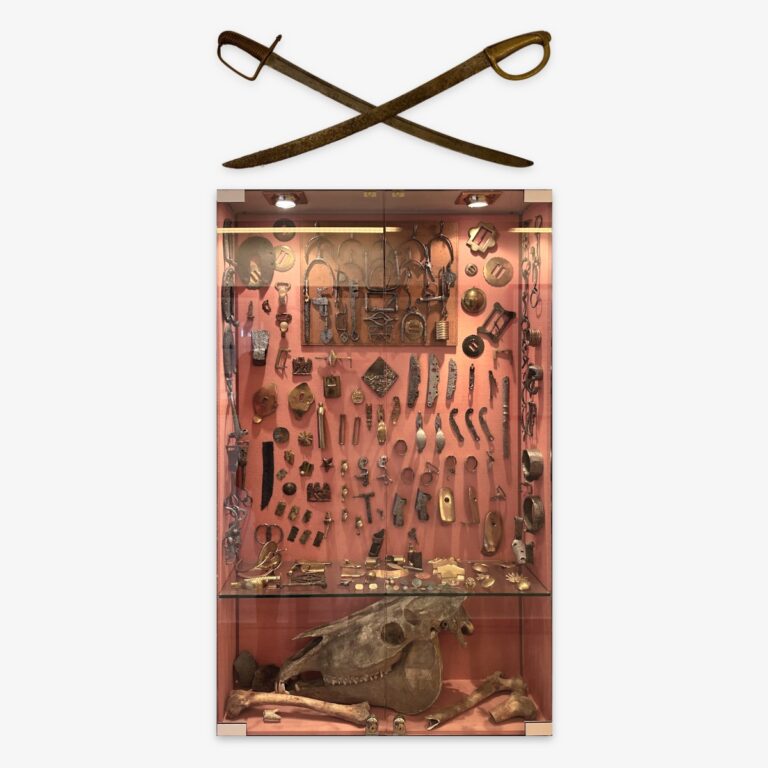 Feldfunde rund um Pferd und Marschbetrieb: Trensen, Sporen, Hufeisen und Teile von Pferdegeschirr zeigen die…