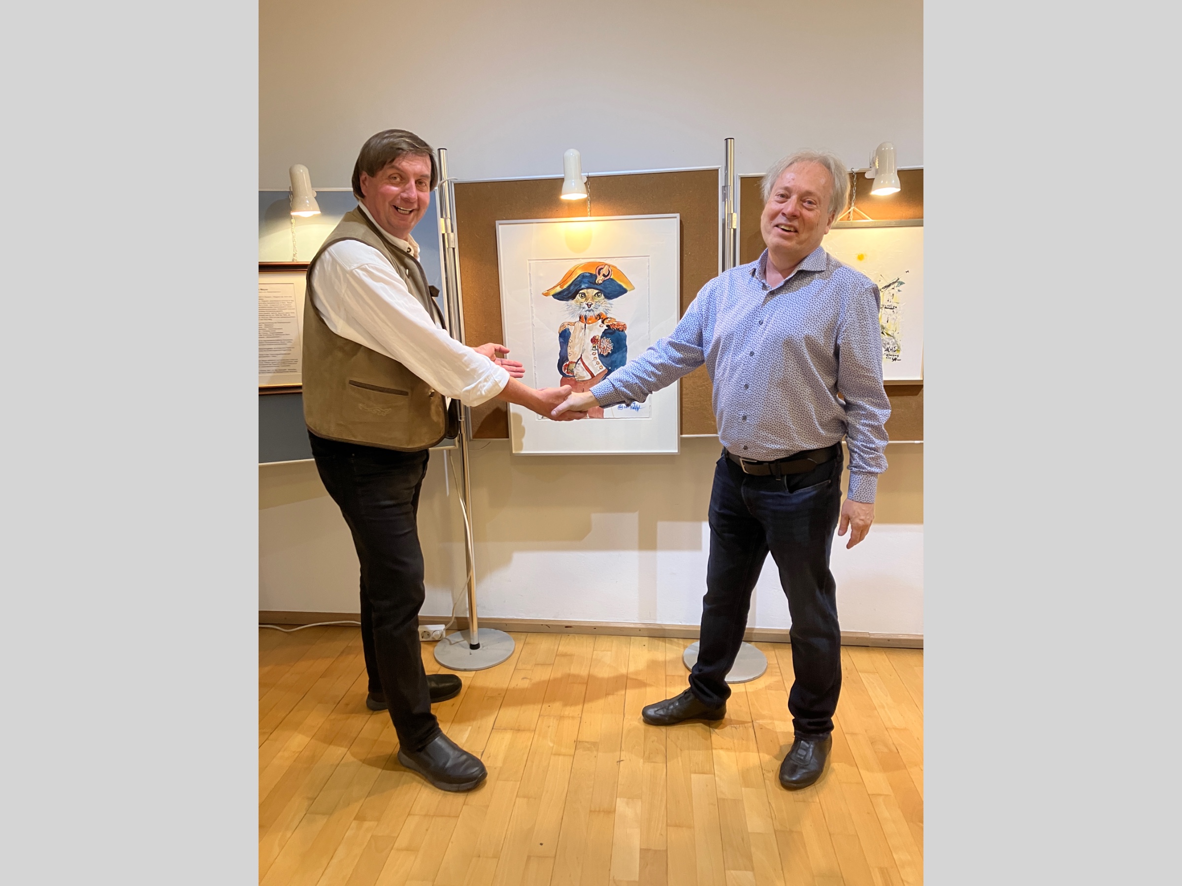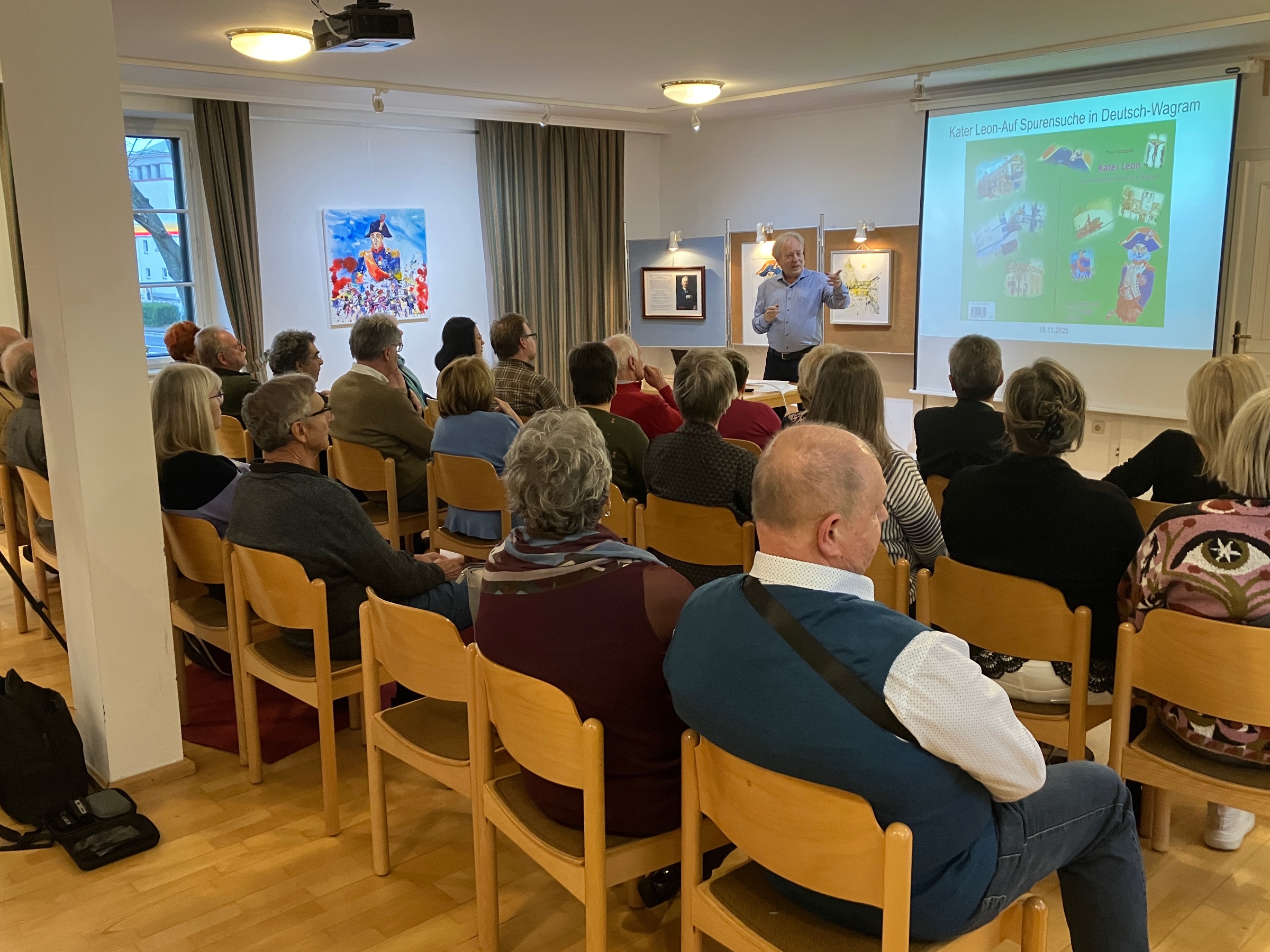 Zum Abschluss übergab Paul Holzapfel der Museumsgesellschaft das Originalbild von Kater Leon, das nun einen würdigen Platz im Erzherzog Carl-Saal gefunden hat – eine großzügige Geste, über die wir uns sehr freuen und für die wir ihm im Namen der gesamten Museumsgesellschaft Deutsch-Wagram unseren herzlichen Dank aussprechen dürfen.