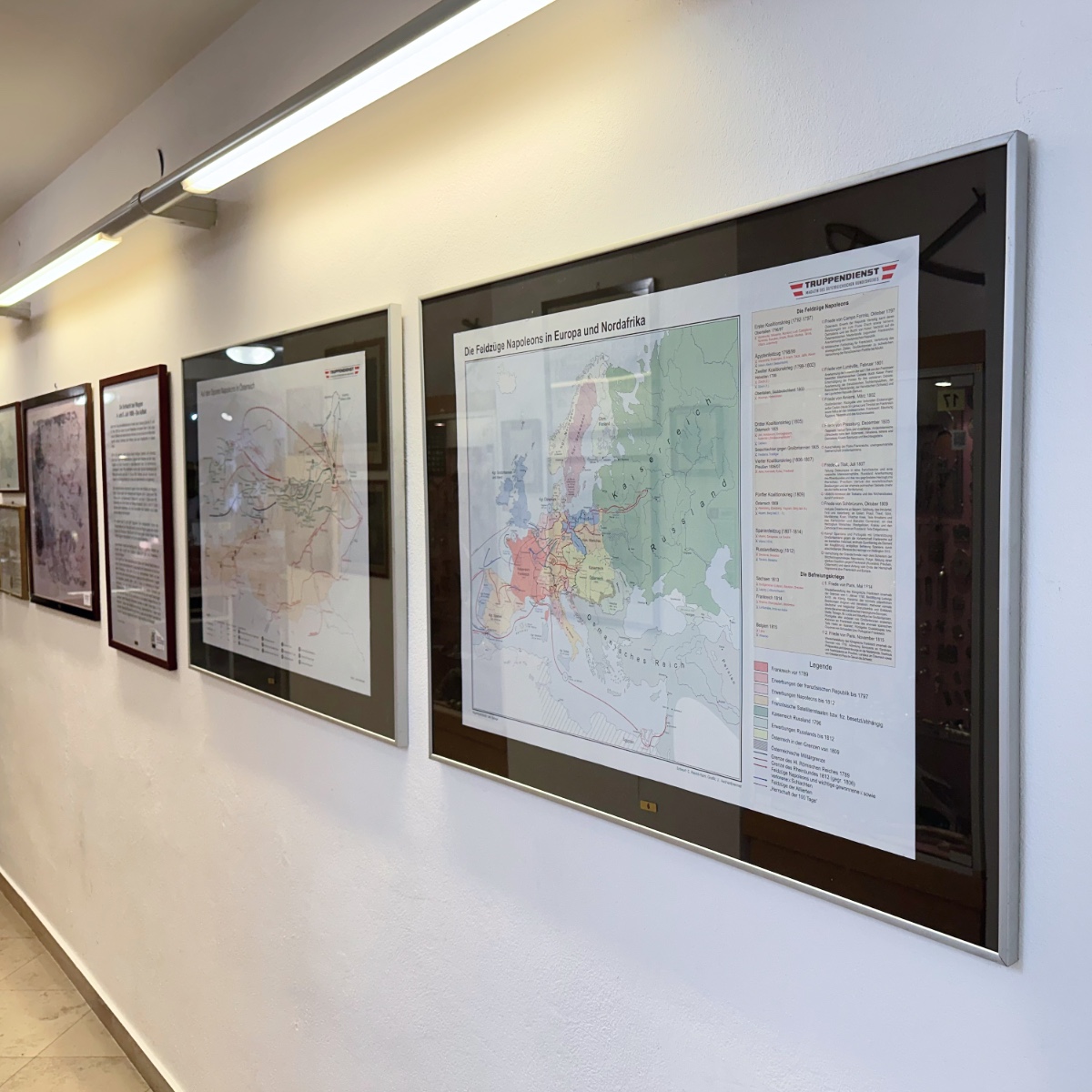 Karten und Legenden aus dem Truppendienst des österreichischen Bundesheeres veranschaulichen Napoleons Feldzüge sowie den Verlauf der Schlacht bei Wagram (4.–6. Juli 1809) mit Stellungen, Phasen und Zeitangaben auf mehreren Lageplänen. Ergänzt wird der Bereich durch originale Schriftstücke – darunter ein eigenhändig unterschriebener Befehl von Erzherzog Carl, Einquartierungszettel und Landwehrkarten – sowie Darstellungen der Schlacht und französische Karikaturen.