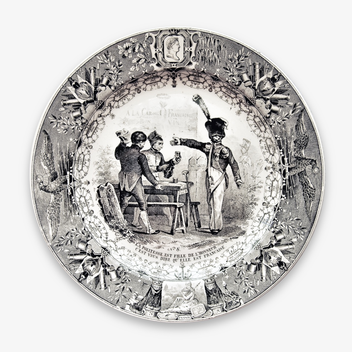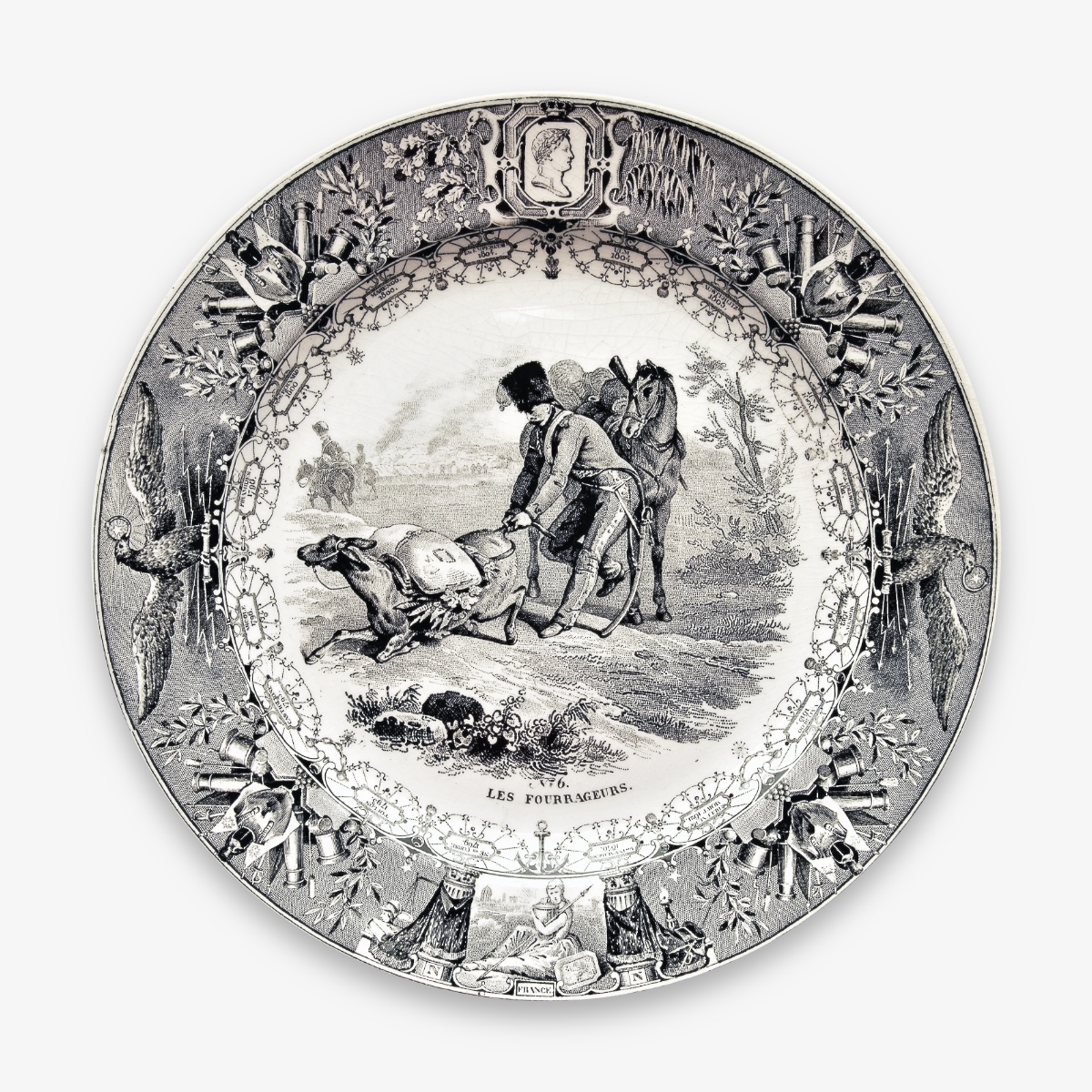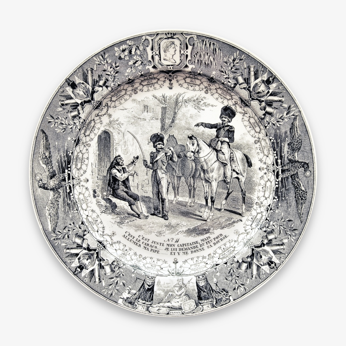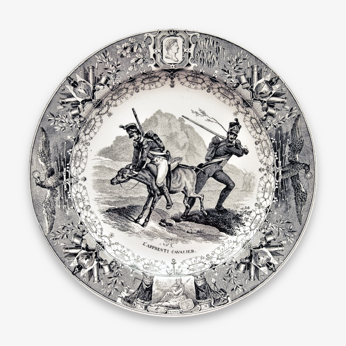 Acht französische Andenkenteller aus der Zeit um 1840. Die Teller zeigen gedruckte Szenen mit Reiter- und Soldatendarstellungen sowie Episoden aus den napoleonischen Kriegen; am Rand finden sich Motive zu Napoleons Leben – von der Geburt auf Korsika bis zur Überführung 1840 in den Invalidendom. Serienhaft im Transferdruck gefertigt, beliebt in bürgerlichen Haushalten. Solche Serien wurden als dekoratives Geschirr gesammelt, verschenkt und zu besonderen Anlässen verwendet.