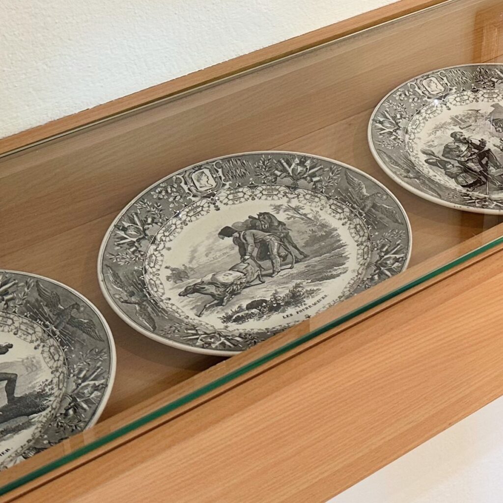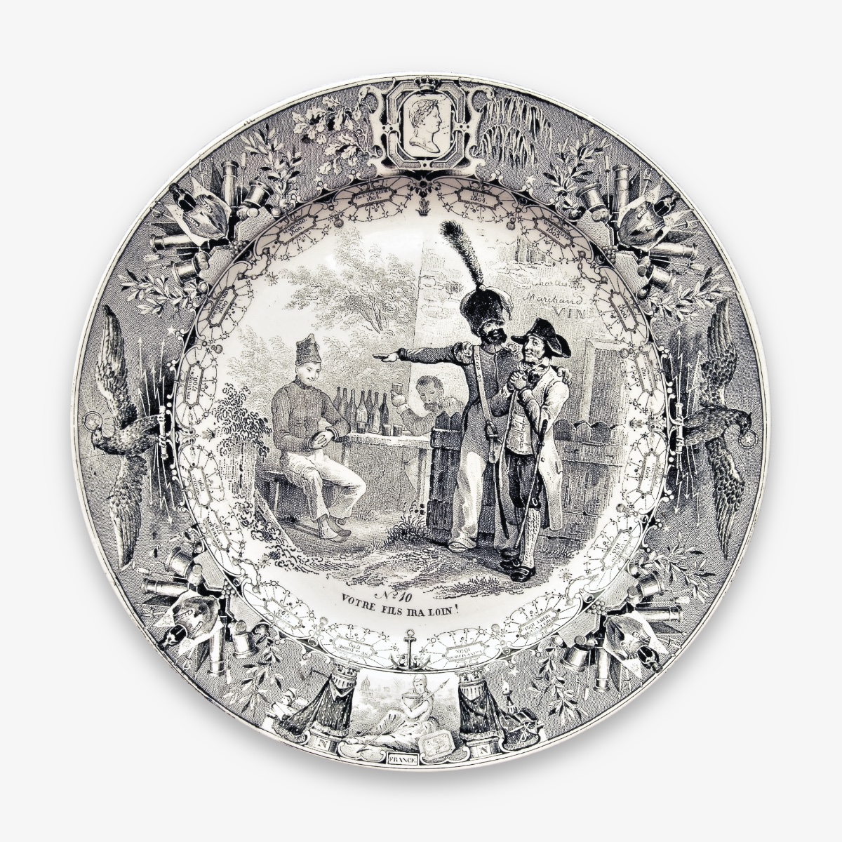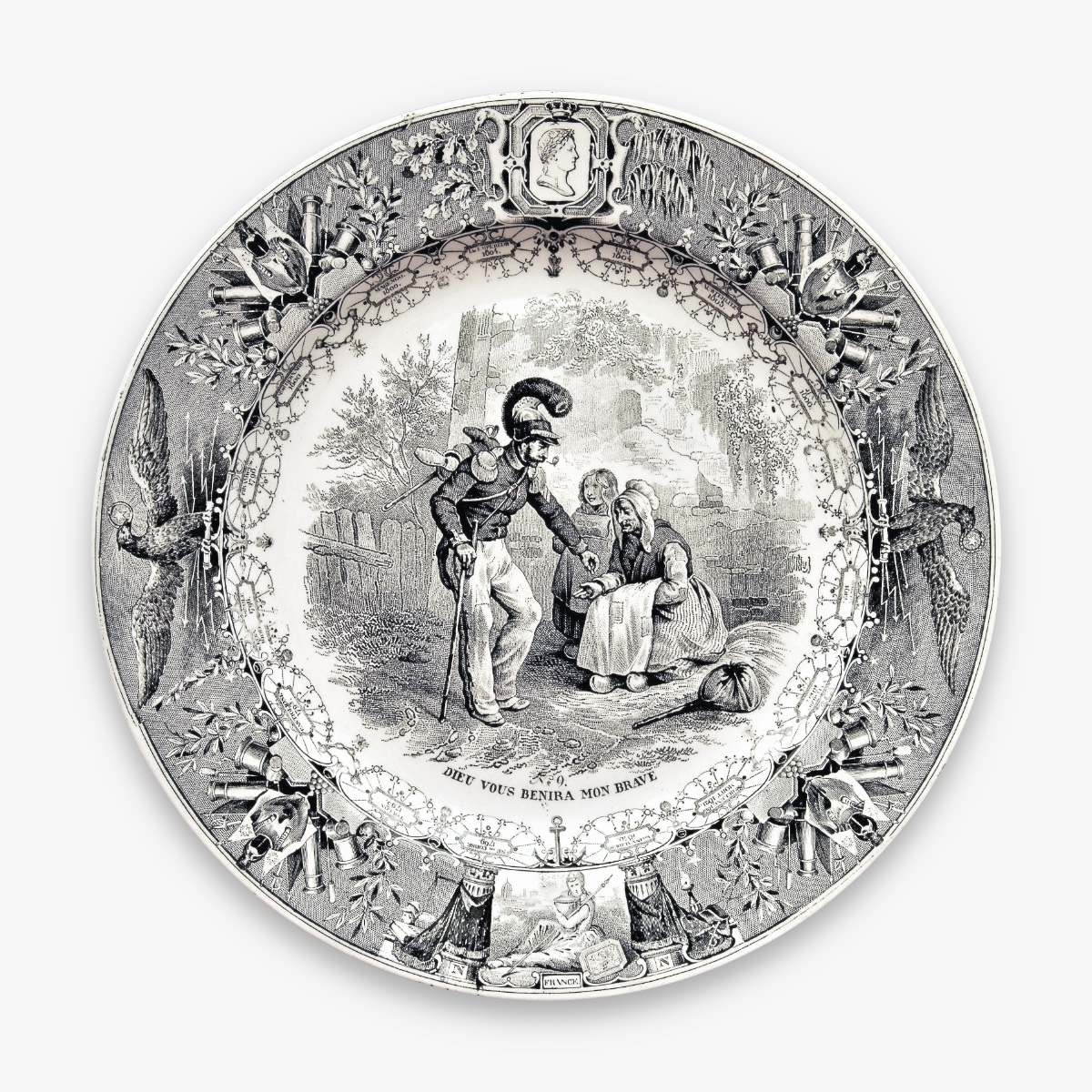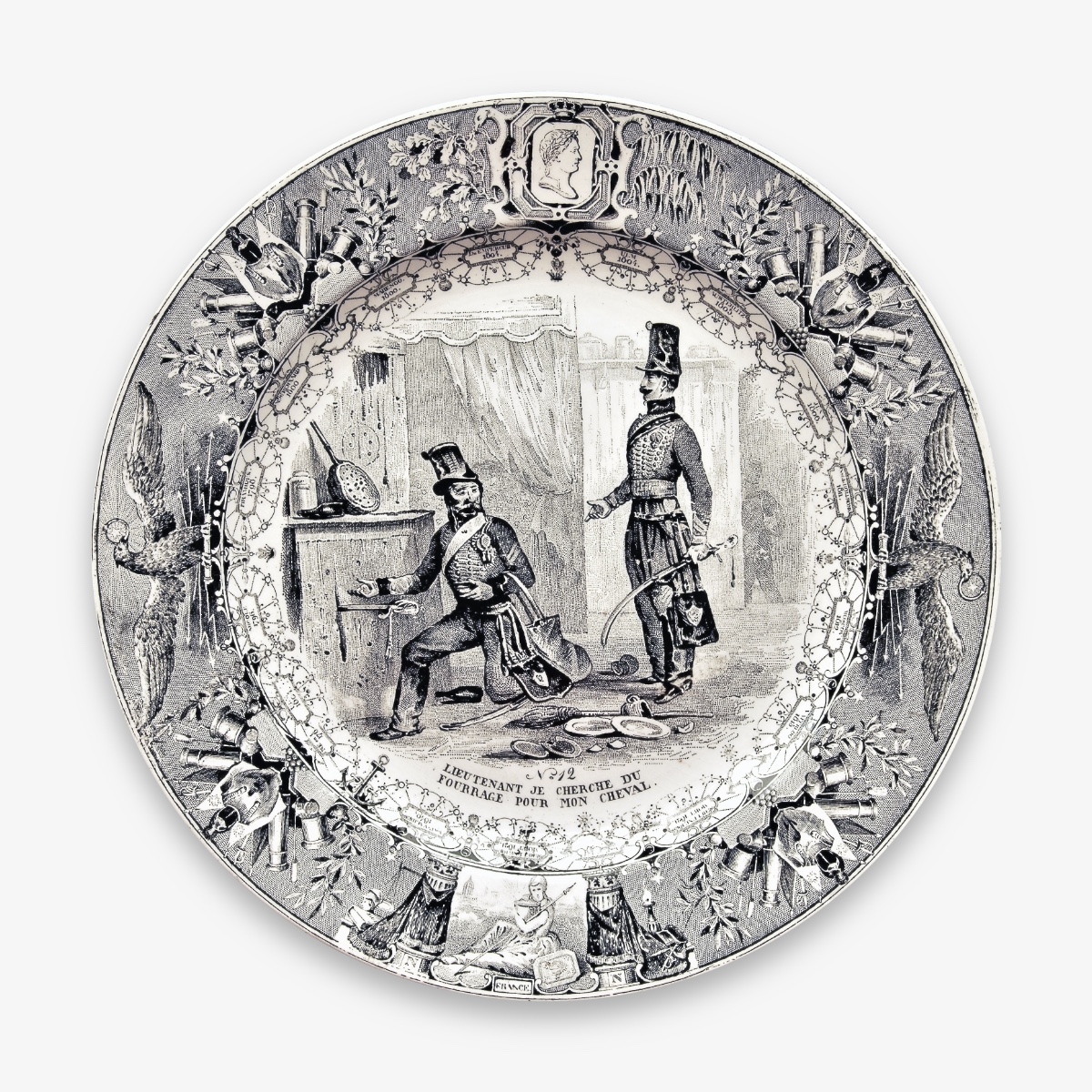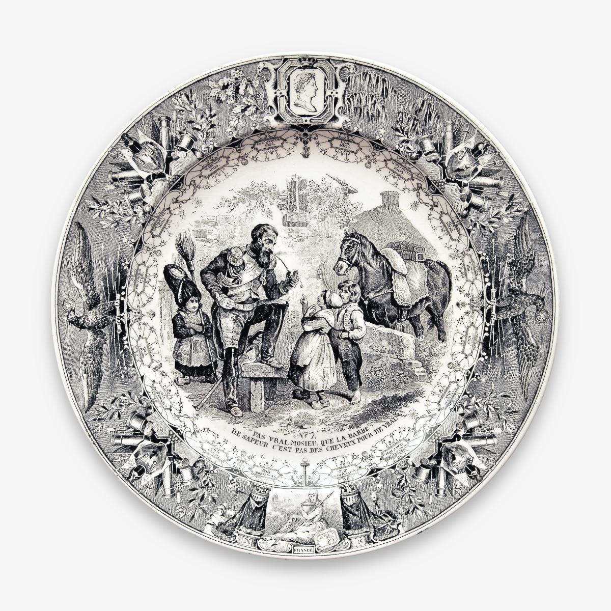 Acht französische Andenkenteller aus der Zeit um 1840. Die Teller zeigen gedruckte Szenen mit Reiter- und Soldatendarstellungen sowie Episoden aus den napoleonischen Kriegen; am Rand finden sich Motive zu Napoleons Leben – von der Geburt auf Korsika bis zur Überführung 1840 in den Invalidendom. Serienhaft im Transferdruck gefertigt, beliebt in bürgerlichen Haushalten. Solche Serien wurden als dekoratives Geschirr gesammelt, verschenkt und zu besonderen Anlässen verwendet.