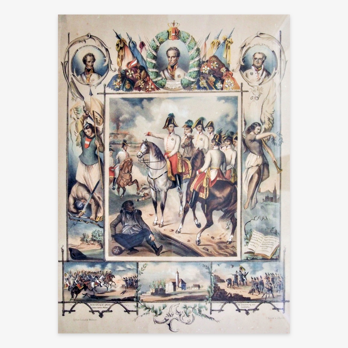 Der kolorierte Stich zeigt Erzherzog Carl als hervorgehobene Figur des Geschehens. Die Darstellung erinnert an die Schlacht bei Aspern am 21. und 22. Mai 1809, in der die österreichische Armee Napoleons Truppen erstmals in einer Feldschlacht aufhielt. Auf österreichischer Seite standen 84.500 Mann Infanterie, 14.360 Reiter und 292 Geschütze im Einsatz. Das Blatt ist nicht nur ein Bild der Schlacht, sondern auch ein patriotisches Erinnerungsstück, das Erzherzog Carl als Symbol österreichischen Widerstands hervorhebt.