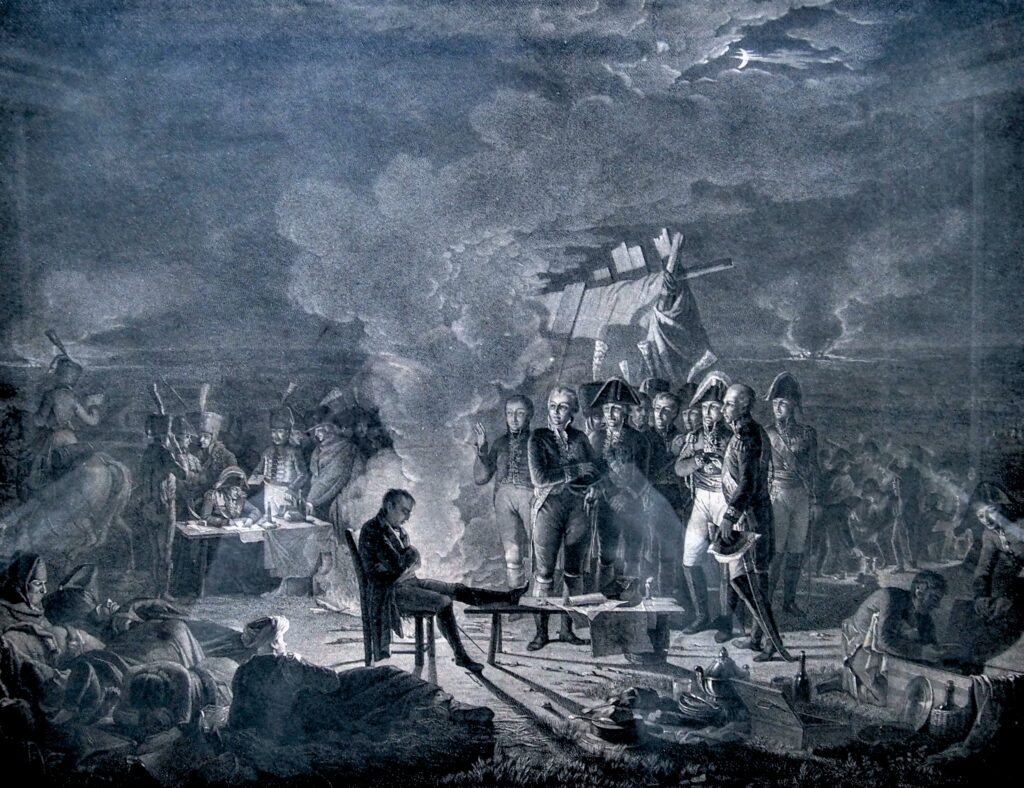 Le Bivouac de Napoléon, bataille de Wagram. Eine der bekanntesten Darstellungen Napoleons in der Schlacht bei Wagram. Sie zeigt Napoleon am „Napoleonhügel“ bei Raasdorf in der Nacht vom 5. auf den 6. Juli.