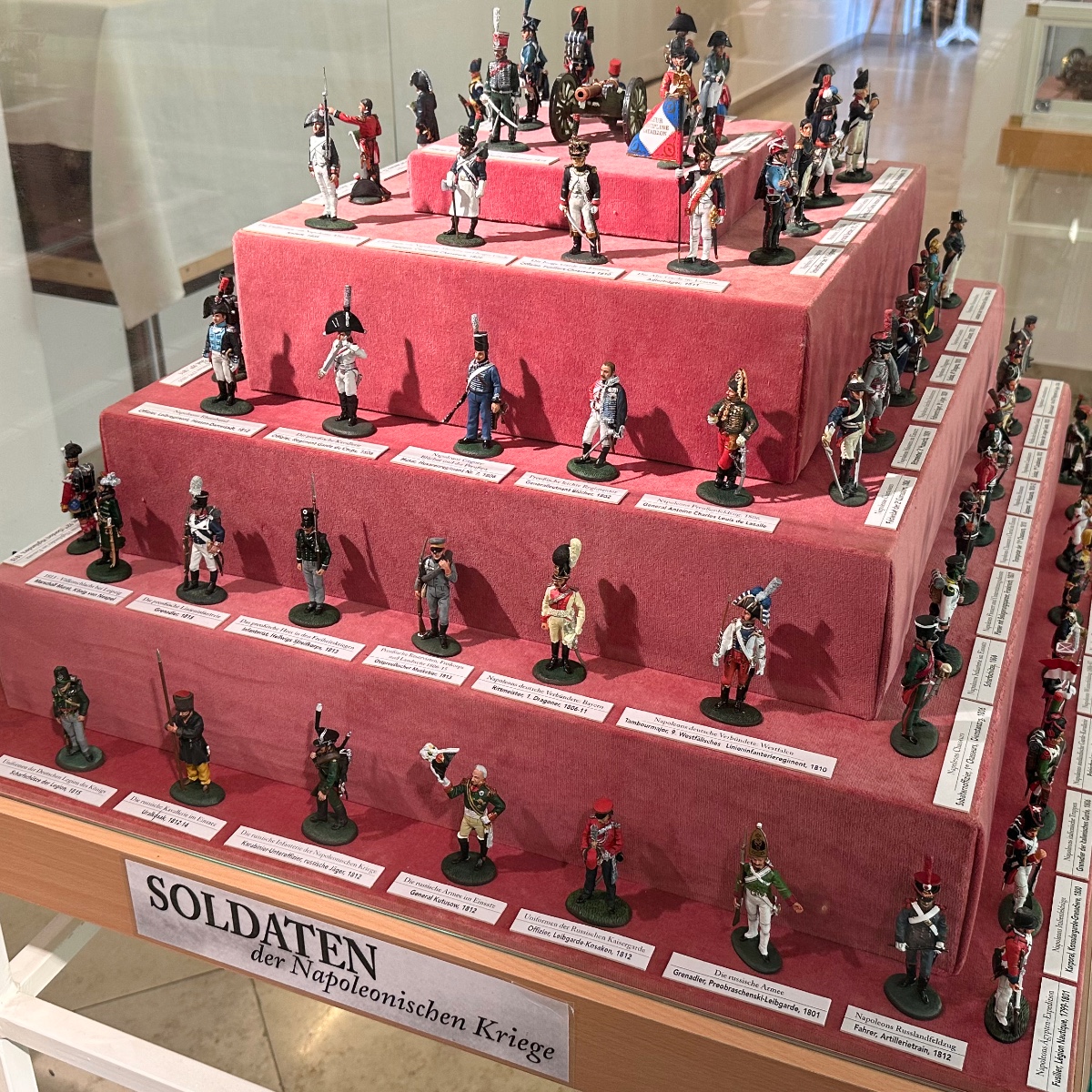 Rund 100 bemalte Miniatursoldaten aus der Zeit Napoleons, geordnet auf einem mehrstufigen Podest. Es handelt sich um Zinnfiguren der Sammlerreihe von del Prado, einer der bekanntesten Serien der letzten Jahrzehnte. Die Figuren zeigen unterschiedliche Uniformen, Kopfbedeckungen und Ausrüstungen – von Linieninfanterie über Elite- und leichte Truppen bis zu weiteren Waffengattungen. Kleine Beschriftungen ordnen die einzelnen Soldaten den jeweiligen Typen und Einheiten zu; einzelne Fahnen/Standarten sind ebenfalls dargestellt.