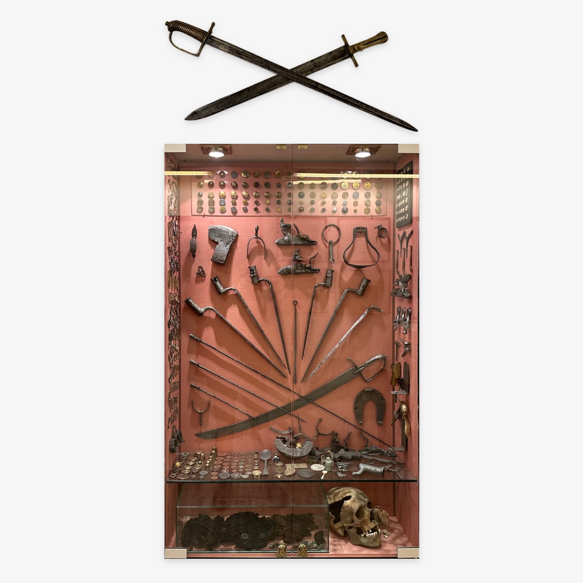 Zahlreiche Feldfunde: Uniformknöpfe, Schnallen, Ladestöcke, Wäscheknöpfe und verschiedene Waffenteile – kleine Metallobjekte, die vom Soldatenalltag ebenso erzählen wie vom Kampfgeschehen. Dazu ein Totenkopf sowie ein Kieferrest mit Zahn als eindringliche Spuren des Gefechts. Ergänzend sind mehrere Blankwaffen bzw. Klingen zu sehen: ein Grenadiersäbel aus Frankreich, eine Pallaschklinge (für Artillerie), ein Hirschfänger sowie ein Bajonett (preußisch, Modell 1809).