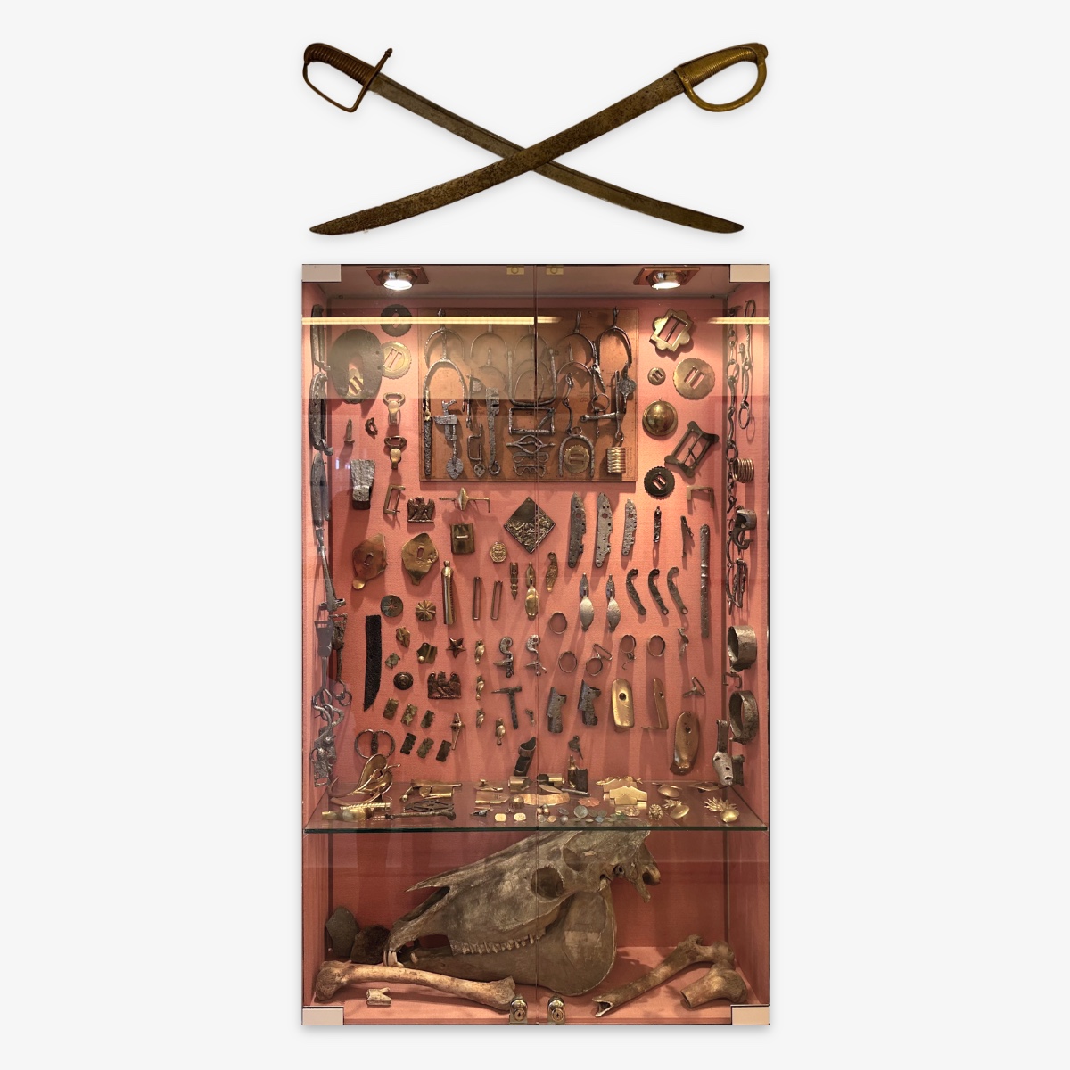 Feldfunde rund um Pferd und Marschbetrieb: Trensen, Sporen, Hufeisen und Teile von Pferdegeschirr zeigen die zentrale Rolle der Kavallerie. Dazu Werkzeug, Geschosssplitter sowie Eisen- und Bleikugeln unterschiedlicher Kaliber und weitere Waffenteile. Ein Pferdeschädel erinnert an die Belastungen von Mensch und Tier. Ergänzend Blankwaffen: bayerischer Grenadiersäbel (um 1800) und französischer „sabre briquet“ (M 1801).