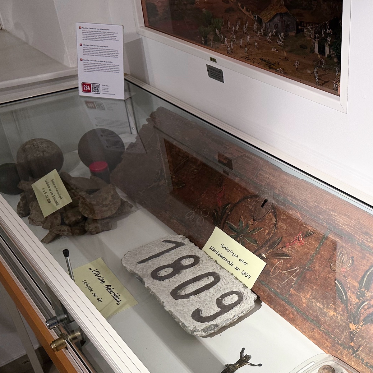 Funde aus Aderklaa (Leihgabe Alfred Mühl): Uniformknöpfe und kleinere Metallteile aus Ausrüstung und Bekleidung. Dazu Munition in verschiedenen Größen – mehrere Kanonenkugeln sowie kleinere Rundkugeln. Ergänzt wird die Vitrine durch die Vorderfront einer Wäschekommode (1804) und macht damit auch das zivile Umfeld der Ereignisse sichtbar.