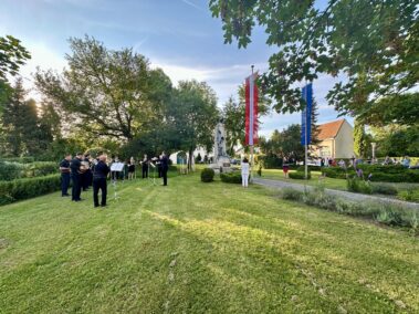 Im Anschluss an die ökumenische Friedensandacht bei der Monumentalkapelle erfolgte, wie in jedem Jahr, eine feierliche Kranzniederlegung am Denkmal der Schlacht bei Wagram, gelegen an der Erzherzog Carl-Straße / Sachsenklemme.