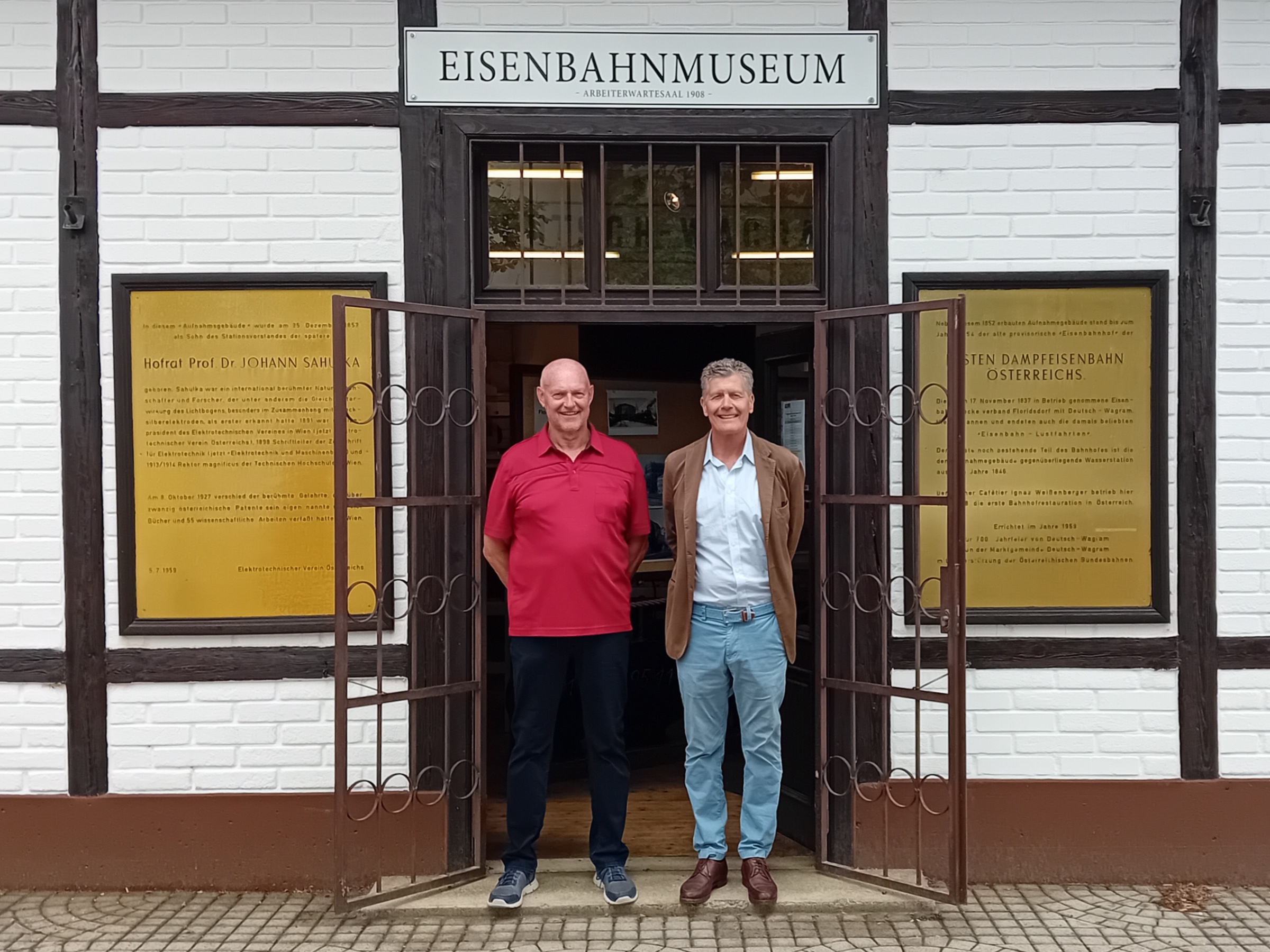Karl Hohenlohe mit Museumsdirektor Rudolf Rossak während der Dreharbeiten im Juni 2025 vor dem Eisenbahnmuseum Deutsch-Wagram. Foto: © ORF ON